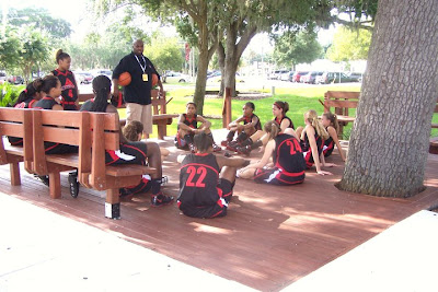 It is a requirement that at all meetings, training and practice sessions, Atlanta Select coaches conduct a "Life Skills" session. Below Coach McCrae conducts a "Life Skills" session between games at the YBOA Nationals last summer. By the way, the team finished second in the nation.